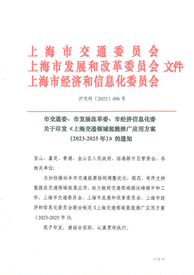 市交通委、市發(fā)展改革委、市經(jīng)濟信息化委關(guān)于印發(fā)《上海交通領(lǐng)域氫能推廣應(yīng)用方案(2023-2025年)》的通知