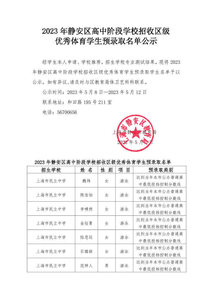 2023年靜安區(qū)高中階段學校招收區(qū)級優(yōu)秀體育學生預錄取名單公示
