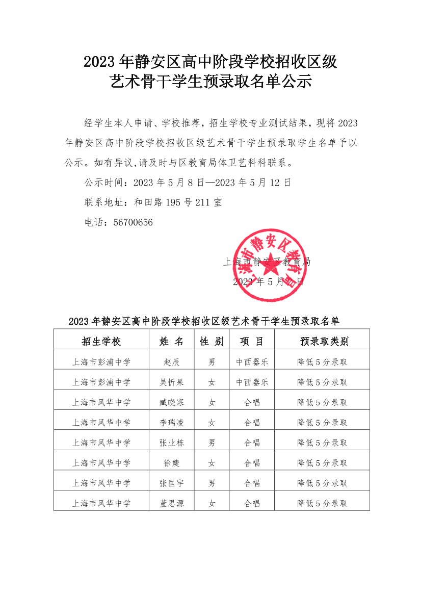 2023年靜安區(qū)高中階段學(xué)校招收區(qū)級(jí)藝術(shù)骨干學(xué)生預(yù)錄取名單公示