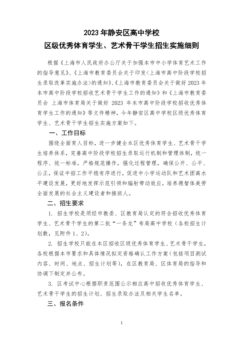 ??根據(jù)《上海市人民政府辦公廳關于加強本市中小學體育藝術(shù)工作的指導意見》、《上海市教教育委員會關于印發(fā)<上海市高中階段學校招生錄取改革實施辦法>的通知》、《上海市教育委員會關于做好 2023 年本市高中階段學校招收藝術(shù)骨干學生工作的通知》和《上海市教育委員會 上海市體育局關于做好 2023 年本市高中階段學校招收優(yōu)秀體育學生工作的通知》等文件精神,今年靜安區(qū)高中學校區(qū)級優(yōu)秀體育學生、藝術(shù)骨干學生招生實施方案如下。