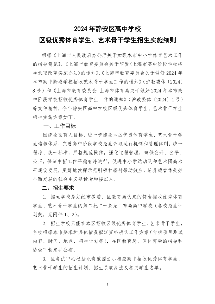 ??根據(jù)《上海市人民政府辦公廳關(guān)于加強本市中小學(xué)體育藝術(shù)工作的指導(dǎo)意見》、《上海市教育委員會關(guān)于印發(fā)<上海市高中階段學(xué)校招生錄取改革實施辦法>的通知》、《上海市教育委員會關(guān)于做好2024年本市高中階段學(xué)校招收藝術(shù)骨干學(xué)生工作的通知》(滬教委體〔2024〕8號)和《上海市教育委員會 上海市體育局關(guān)于做好2024年本市高中階段學(xué)校招收優(yōu)秀體育學(xué)生工作的通知》(滬教委體〔2024〕4號)等文件精神,今年靜安區(qū)高中學(xué)校區(qū)級優(yōu)秀體育學(xué)生、藝術(shù)骨干學(xué)生招生實施方案如下。