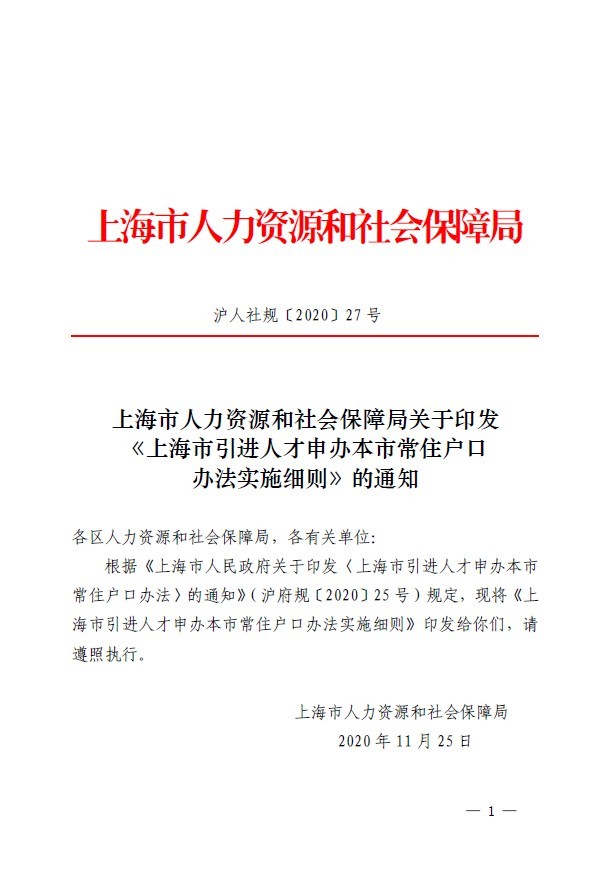 ??根據(jù)《上海市人民政府關(guān)于印發(fā)〈上海市引進(jìn)人才申辦本市常住戶口辦法〉的通知》(滬府規(guī)〔2020〕25號(hào))規(guī)定,現(xiàn)將《上海市引進(jìn)人才申辦本市常住戶口辦法實(shí)施細(xì)則》印發(fā)給你們,請(qǐng)遵照?qǐng)?zhí)行。
