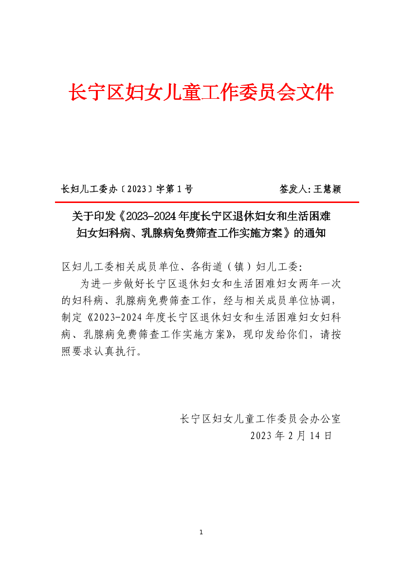 關(guān)于印發(fā)《2023-2024年度長(zhǎng)寧區(qū)退休婦女和生活困難婦女婦科病、乳腺病免費(fèi)篩查工作實(shí)施方案》的通知