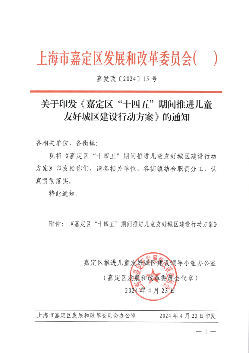 ??現(xiàn)將《嘉定區(qū)“十四五”期間推進兒童友好城區(qū)建設(shè)行動方案》印發(fā)給你們,請各相關(guān)單位、各街鎮(zhèn)結(jié)合職責分工,認真貫徹落實。
