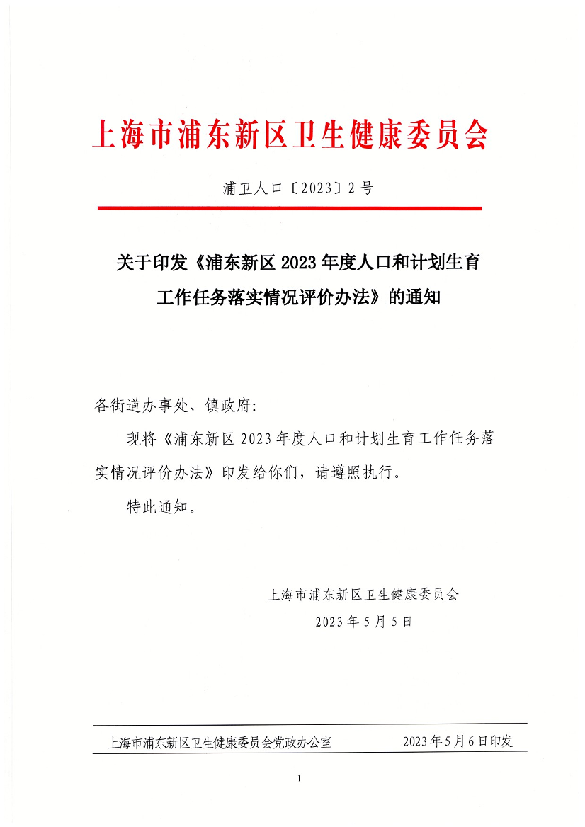 關于印發(fā)《浦東新區(qū)2023年度人口和計劃生育工作任務落實情況評價辦法》的通知
