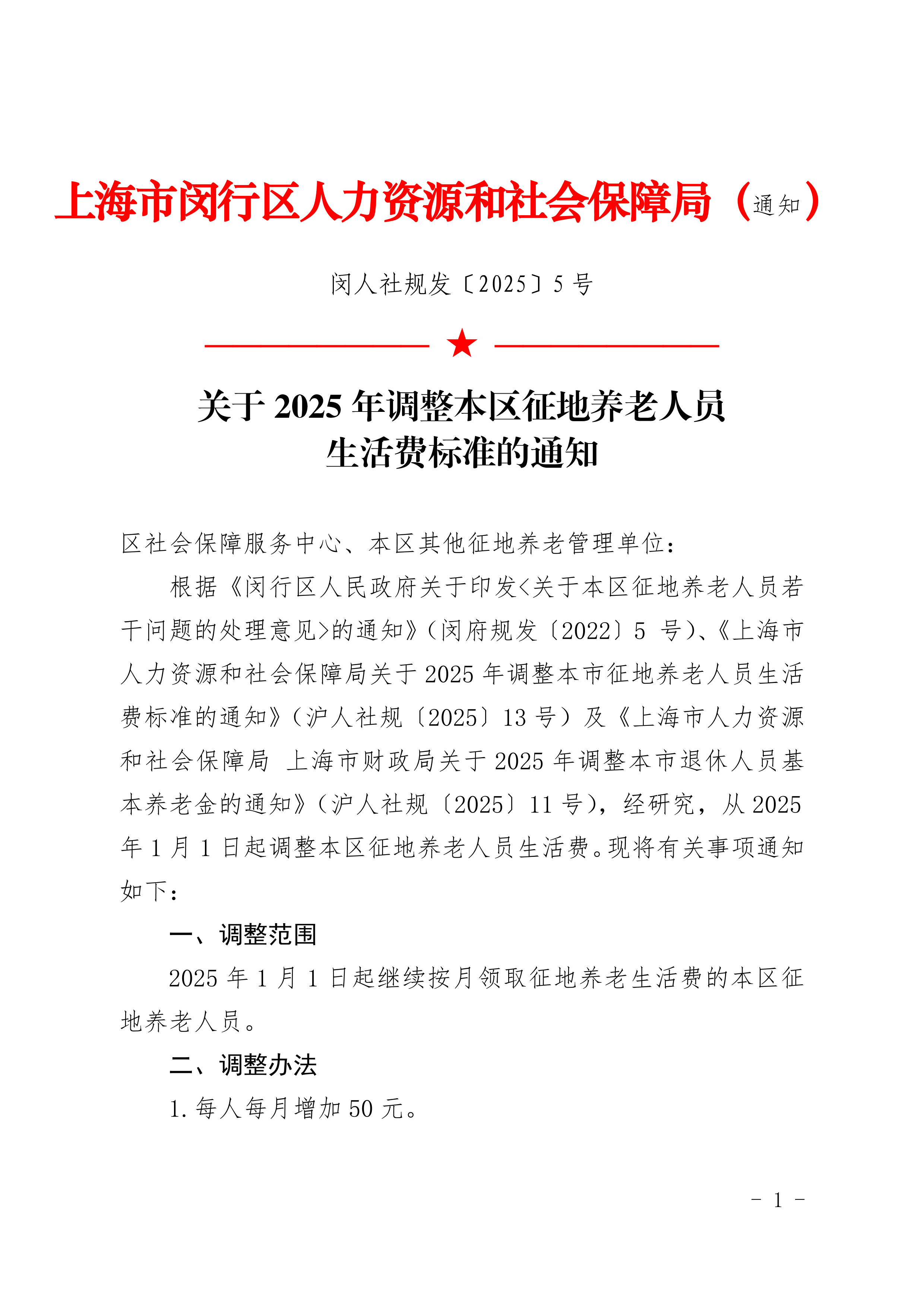 ??根據(jù)《閔行區(qū)人民政府關(guān)于印發(fā)<關(guān)于本區(qū)征地養(yǎng)老人員若干問題的處理意見>的通知》(閔府規(guī)發(fā)〔2022〕5 號)、《上海市人力資源和社會保障局關(guān)于2025年調(diào)整本市征地養(yǎng)老人員生活費(fèi)標(biāo)準(zhǔn)的通知》(滬人社規(guī)〔2025〕13號)及《上海市人力資源和社會保障局 上海市財(cái)政局關(guān)于2025年調(diào)整本市退休人員基本養(yǎng)老金的通知》(滬人社規(guī)〔2025〕11號),經(jīng)研究,從2025年1月1日起調(diào)整本區(qū)征地養(yǎng)老人員生活費(fèi)?,F(xiàn)將有關(guān)事項(xiàng)通知如下: