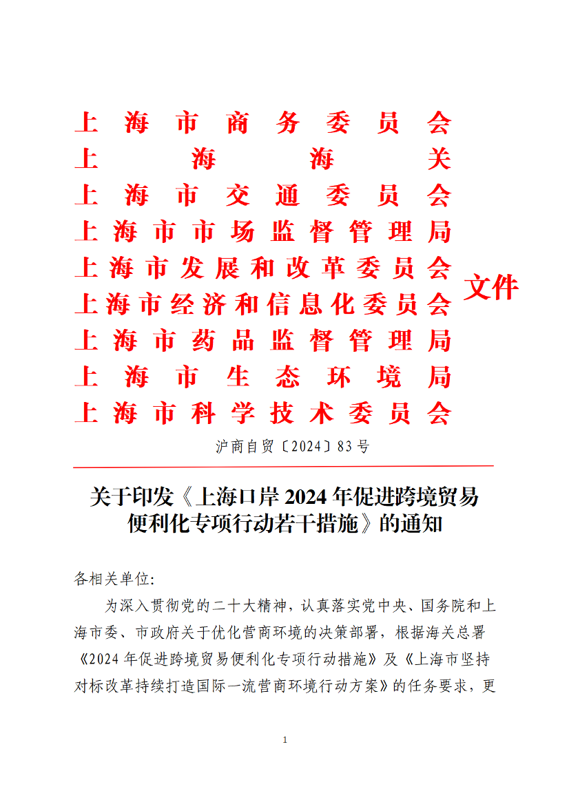 ??為深入貫徹黨的二十大精神,認(rèn)真落實(shí)黨中央、國(guó)務(wù)院和上海市委、市政府關(guān)于優(yōu)化營(yíng)商環(huán)境的決策部署,根據(jù)海關(guān)總署《2024年促進(jìn)跨境貿(mào)易便利化專(zhuān)項(xiàng)行動(dòng)措施》及《上海市堅(jiān)持對(duì)標(biāo)改革持續(xù)打造國(guó)際一流營(yíng)商環(huán)境行動(dòng)方案》的任務(wù)要求,更大力度提升跨境貿(mào)易便利化水平,持續(xù)打造市場(chǎng)化、法治化、國(guó)際化一流口岸營(yíng)商環(huán)境,市商務(wù)委、上海海關(guān)、市交通委、市市場(chǎng)監(jiān)管局、市發(fā)展改革委、市經(jīng)濟(jì)信息化委、市藥品監(jiān)管局、市生態(tài)環(huán)境局、市科委等九部門(mén)和單位共同制定了《上海口岸2024年促進(jìn)跨境貿(mào)易便利化專(zhuān)項(xiàng)行動(dòng)若干措施》,經(jīng)市政府同意,現(xiàn)印發(fā)給你們,請(qǐng)認(rèn)真做好組織實(shí)施工作。