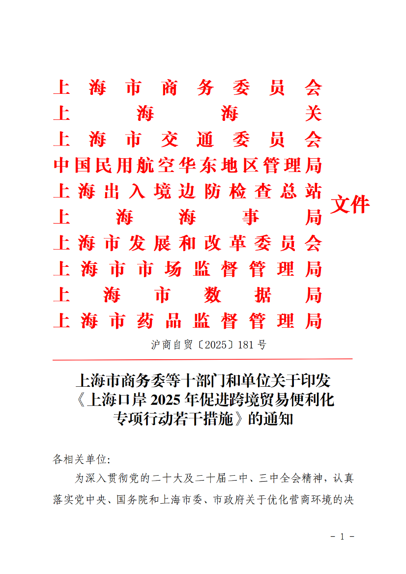 ??為深入貫徹黨的二十大及二十屆二中、三中全會精神,認(rèn)真落實黨中央、國務(wù)院和上海市委、市政府關(guān)于優(yōu)化營商環(huán)境的決策部署,更大力度提升跨境貿(mào)易便利化水平,持續(xù)打造市場化、法治化、國際化一流口岸營商環(huán)境,根據(jù)海關(guān)總署2025年跨境貿(mào)易便利化專項行動部署及《上海市聚焦提升企業(yè)感受 持續(xù)打造國際一流營商環(huán)境行動方案》任務(wù)要求,市商務(wù)委、上海海關(guān)、市交通委、民航華東地區(qū)管理局、上海邊檢總站、上海海事局、市發(fā)展改革委、市市場監(jiān)管局、市數(shù)據(jù)局、市藥品監(jiān)管局等十部門和單位共同制定了《上??诎?025年促進(jìn)跨境貿(mào)易便利化專項行動若干措施》,經(jīng)市政府同意,現(xiàn)印發(fā)給你們,請認(rèn)真做好組織實施工作。