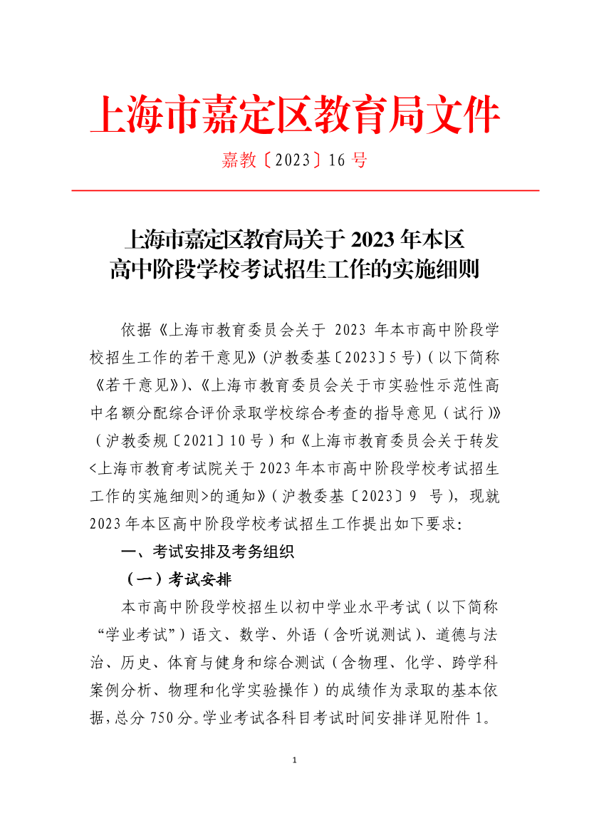 上海市嘉定區(qū)教育局關(guān)于2023年本區(qū)高中階段學(xué)??荚囌猩ぷ鞯膶?shí)施細(xì)則