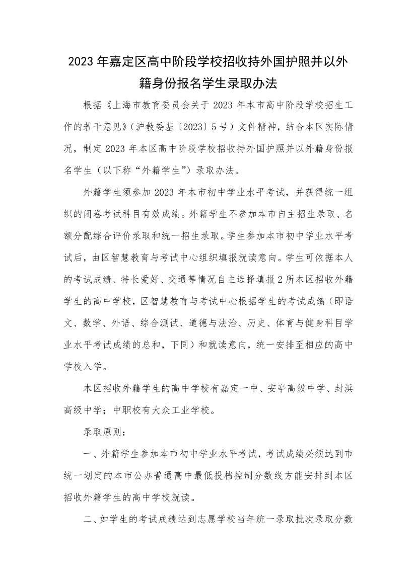??根據(jù)《上海市教育委員會(huì)關(guān)于2023年本市高中階段學(xué)校招生工作的若干意見(jiàn)》(滬教委基〔2023〕5號(hào))文件精神,結(jié)合本區(qū)實(shí)際情況,制定2023年本區(qū)高中階段學(xué)校招收持外國(guó)護(hù)照并以外籍身份報(bào)名學(xué)生(以下稱(chēng)“外籍學(xué)生”)錄取辦法。