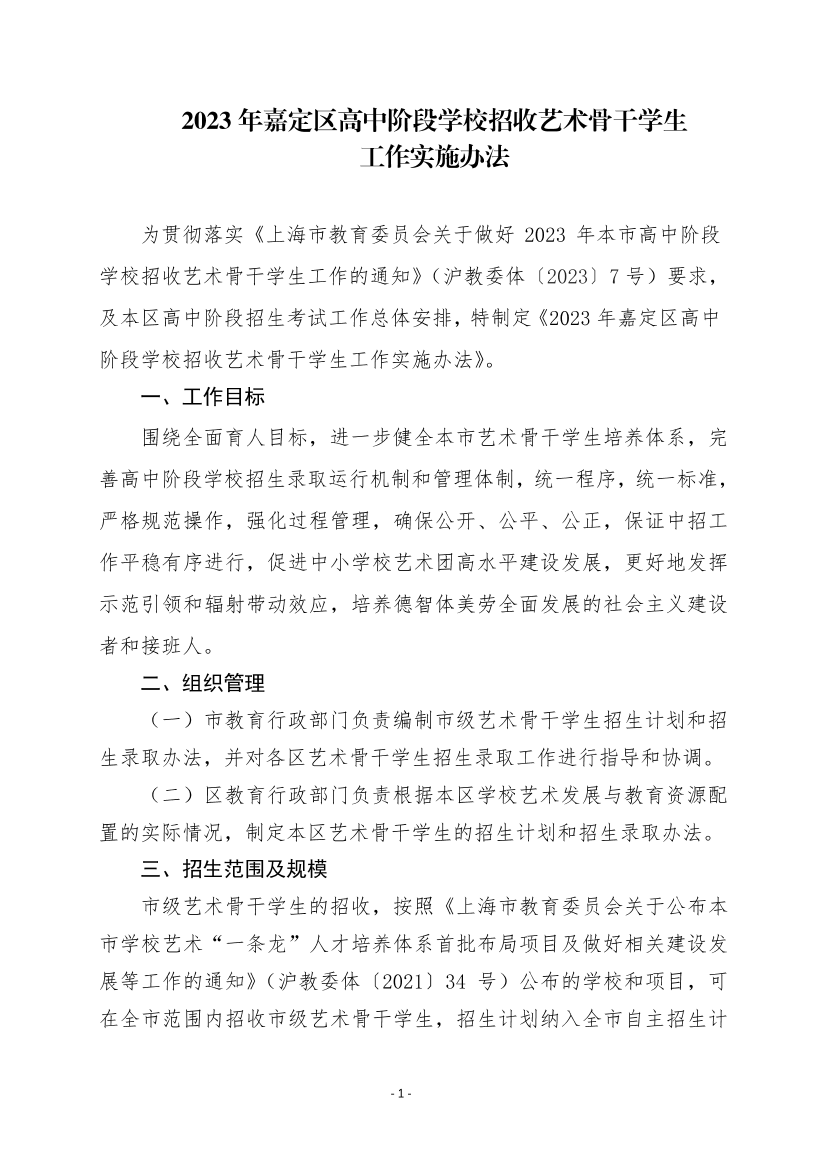 ??為貫徹落實(shí)《上海市教育委員會(huì)關(guān)于做好2023年本市高中階段學(xué)校招收藝術(shù)骨干學(xué)生工作的通知》(滬教委體〔2023〕7號(hào))要求,及本區(qū)高中階段招生考試工作總體安排,特制定《2023年嘉定區(qū)高中階段學(xué)校招收藝術(shù)骨干學(xué)生工作實(shí)施辦法》。