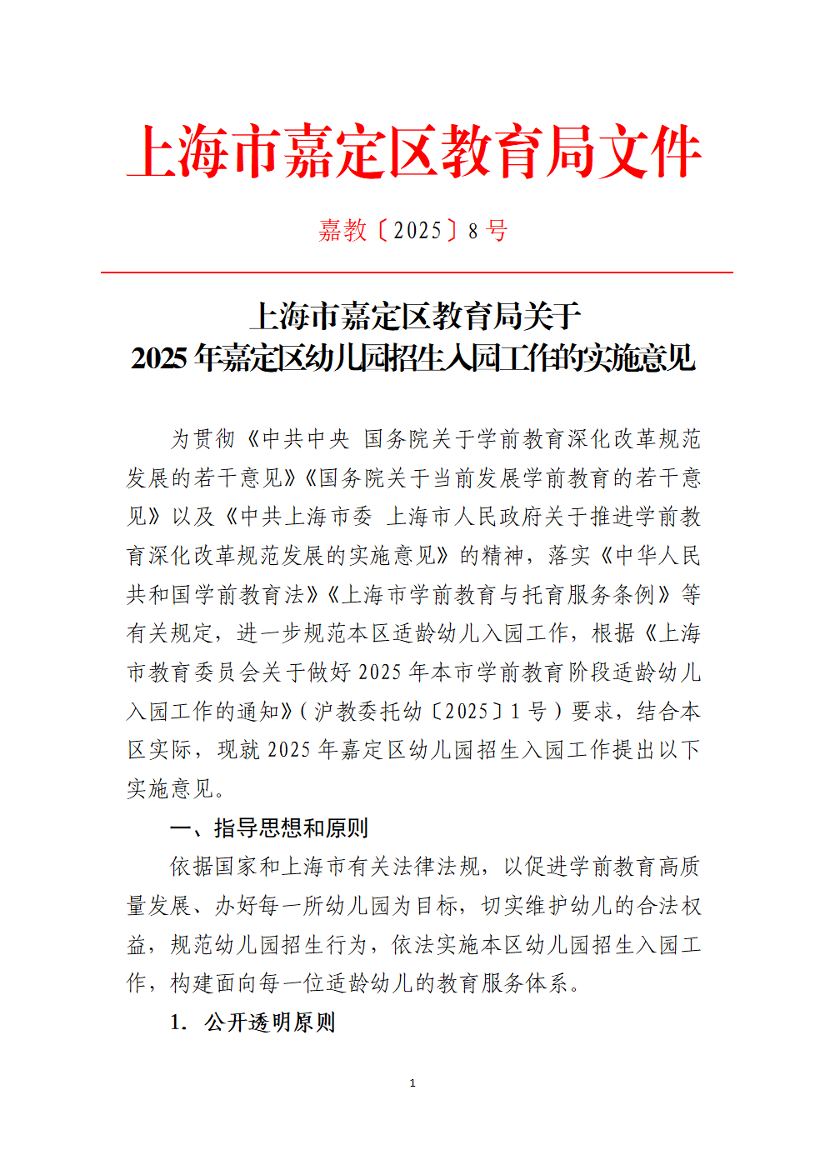 ??為貫徹《中共中央 國(guó)務(wù)院關(guān)于學(xué)前教育深化改革規(guī)范發(fā)展的若干意見》《國(guó)務(wù)院關(guān)于當(dāng)前發(fā)展學(xué)前教育的若干意見》以及《中共上海市委 上海市人民政府關(guān)于推進(jìn)學(xué)前教育深化改革規(guī)范發(fā)展的實(shí)施意見》的精神,落實(shí)《中華人民共和國(guó)學(xué)前教育法》《上海市學(xué)前教育與托育服務(wù)條例》等有關(guān)規(guī)定,進(jìn)一步規(guī)范本區(qū)適齡幼兒入園工作,根據(jù)《上海市教育委員會(huì)關(guān)于做好2025年本市學(xué)前教育階段適齡幼兒入園工作的通知》(滬教委托幼〔2025〕1號(hào))要求,結(jié)合本區(qū)實(shí)際,現(xiàn)就2025年嘉定區(qū)幼兒園招生入園工作提出以下實(shí)施意見。