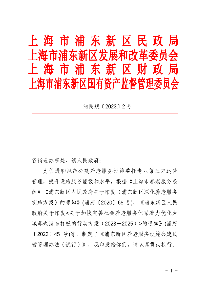 ??為促進(jìn)和規(guī)范公建養(yǎng)老服務(wù)設(shè)施委托專業(yè)第三方運(yùn)營管理,提升設(shè)施服務(wù)能級和水平,根據(jù)《上海市養(yǎng)老服務(wù)條例》《浦東新區(qū)人民政府關(guān)于印發(fā)〈浦東新區(qū)深化養(yǎng)老服務(wù)實(shí)施方案〉的通知》(浦府〔2020〕65號)、《浦東新區(qū)人民政府關(guān)于印發(fā)<關(guān)于加快完善社會養(yǎng)老服務(wù)體系著力優(yōu)化大城養(yǎng)老浦東樣板的行動方案(2023—2025)>的通知》(浦府〔2023〕45號)等,制定了《浦東新區(qū)養(yǎng)老服務(wù)設(shè)施公建民營管理辦法(試行)》,現(xiàn)印發(fā)給你們,請認(rèn)真貫徹執(zhí)行。