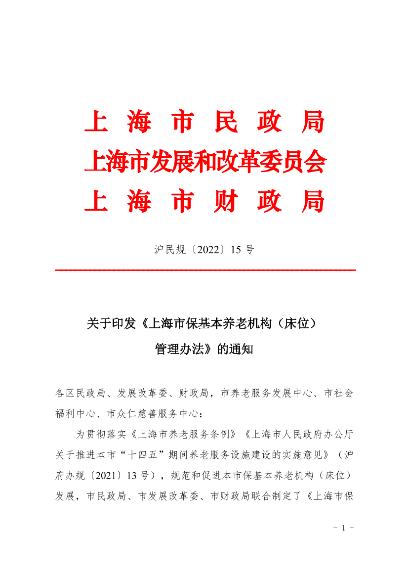 ??為貫徹落實(shí)《上海市養(yǎng)老服務(wù)條例》《上海市人民政府辦公廳關(guān)于推進(jìn)本市“十四五”期間養(yǎng)老服務(wù)設(shè)施建設(shè)的實(shí)施意見》(滬府辦規(guī)〔2021〕13號(hào)),規(guī)范和促進(jìn)本市?;攫B(yǎng)老機(jī)構(gòu)(床位)發(fā)展,市民政局、市發(fā)展改革委、市財(cái)政局聯(lián)合制定了《上海市?;攫B(yǎng)老機(jī)構(gòu)(床位)管理辦法》,現(xiàn)印發(fā)你們,請(qǐng)遵照?qǐng)?zhí)行。