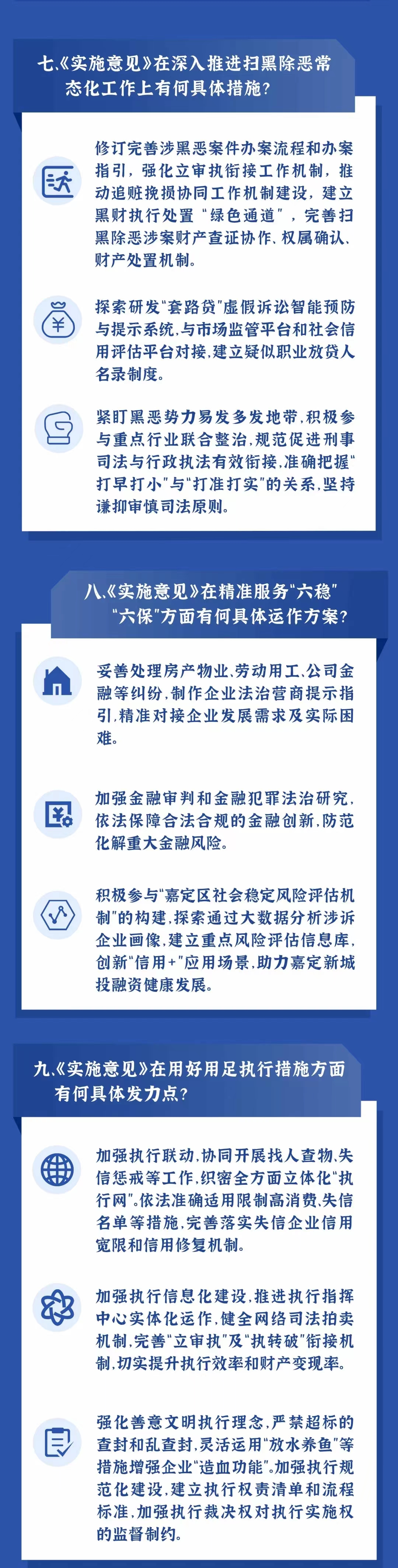??5.精準服務“六穩(wěn)”“六保”,促進經濟發(fā)展穩(wěn)中有進。妥善處理涉疫糾紛,著力強化疫情防控司法供給。妥善處理房產物業(yè)、勞動用工、公司金融等糾紛,充分發(fā)揮司法促發(fā)展、穩(wěn)預期、保民生作用。加大企業(yè)走訪調研力度,定期組織召開座談會、公眾開放日、主題普法宣講和專題培訓。精準對接企業(yè)發(fā)展需求及實際困難,制作企業(yè)法治營商提示指引。加強金融審判和金融犯罪法治研究,依法保障合法合規(guī)的金融創(chuàng)新,防范化解重大金融風險。聯(lián)動區(qū)稅務局進一步強化信息共享和司法協(xié)作等常態(tài)化長效化工作銜接機制。積極參與“嘉定區(qū)社會穩(wěn)定風險評估機制”的構建,探索通過大數據分析涉訴企業(yè)畫像,建立重點風險評估信息庫,創(chuàng)新“信用+”應用場景,助力嘉定新城投融資健康發(fā)展。