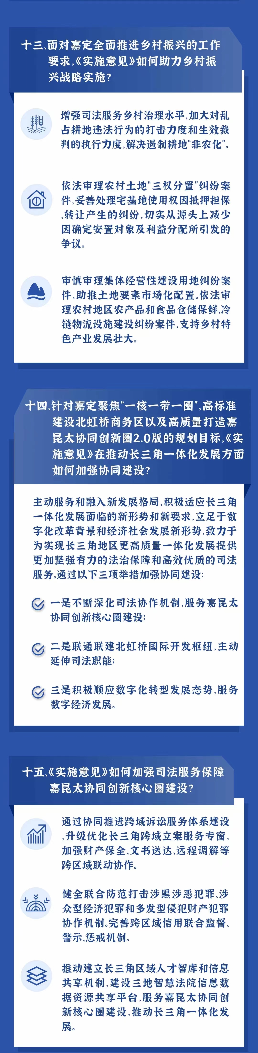 ??10.不斷深化司法協(xié)作機制,服務嘉昆太協(xié)同創(chuàng)新核心圈建設。協(xié)同推進跨域訴訟服務體系建設,升級優(yōu)化長三角跨域立案服務專窗,加強財產保全、文書送達、遠程調解等跨區(qū)域聯(lián)動協(xié)作。健全聯(lián)合防范打擊涉黑涉惡犯罪、涉眾型經濟犯罪和多發(fā)型侵犯財產犯罪協(xié)作機制。完善跨區(qū)域信用聯(lián)合監(jiān)督、警示、懲戒機制。推動建立長三角區(qū)域人才智庫和信息共享機制,建設三地智慧法院信息數據資源共享平臺。