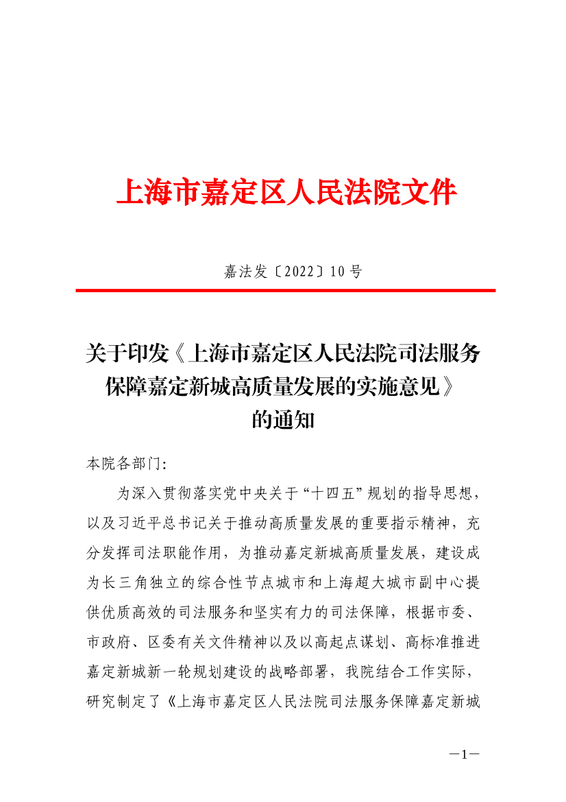 關于印發(fā)《上海市嘉定區(qū)人民法院司法服務保障嘉定新城高質量發(fā)展的實施意見》的通知