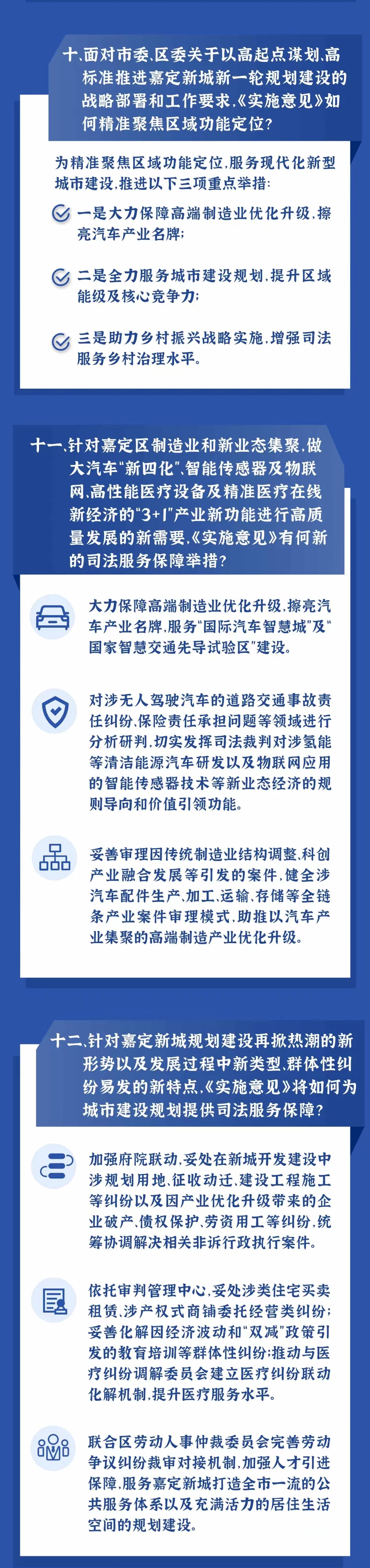 ??7.大力保障高端制造業(yè)優(yōu)化升級,擦亮汽車產業(yè)名牌。聚焦嘉定新城做大汽車“新四化”、智能傳感器及物聯(lián)網、高性能醫(yī)療設備及精準醫(yī)療、在線新經濟的“3+1”產業(yè)新功能,服務“國際汽車智慧城”及“國家智慧交通先導試驗區(qū)”建設。對涉無人駕駛汽車的道路交通事故責任糾紛、保險責任承擔問題等領域進行分析研判,切實發(fā)揮司法裁判對涉氫能等清潔能源汽車研發(fā)以及物聯(lián)網應用的智能傳感器技術等新業(yè)態(tài)經濟的規(guī)則導向和價值引領功能。妥善審理因傳統(tǒng)制造業(yè)結構調整、科創(chuàng)產業(yè)融合發(fā)展等引發(fā)的案件,健全涉汽車配件生產、加工、運輸、存儲等全鏈條產業(yè)案件審理模式,助推以汽車產業(yè)集聚的高端制造產業(yè)優(yōu)化升級。