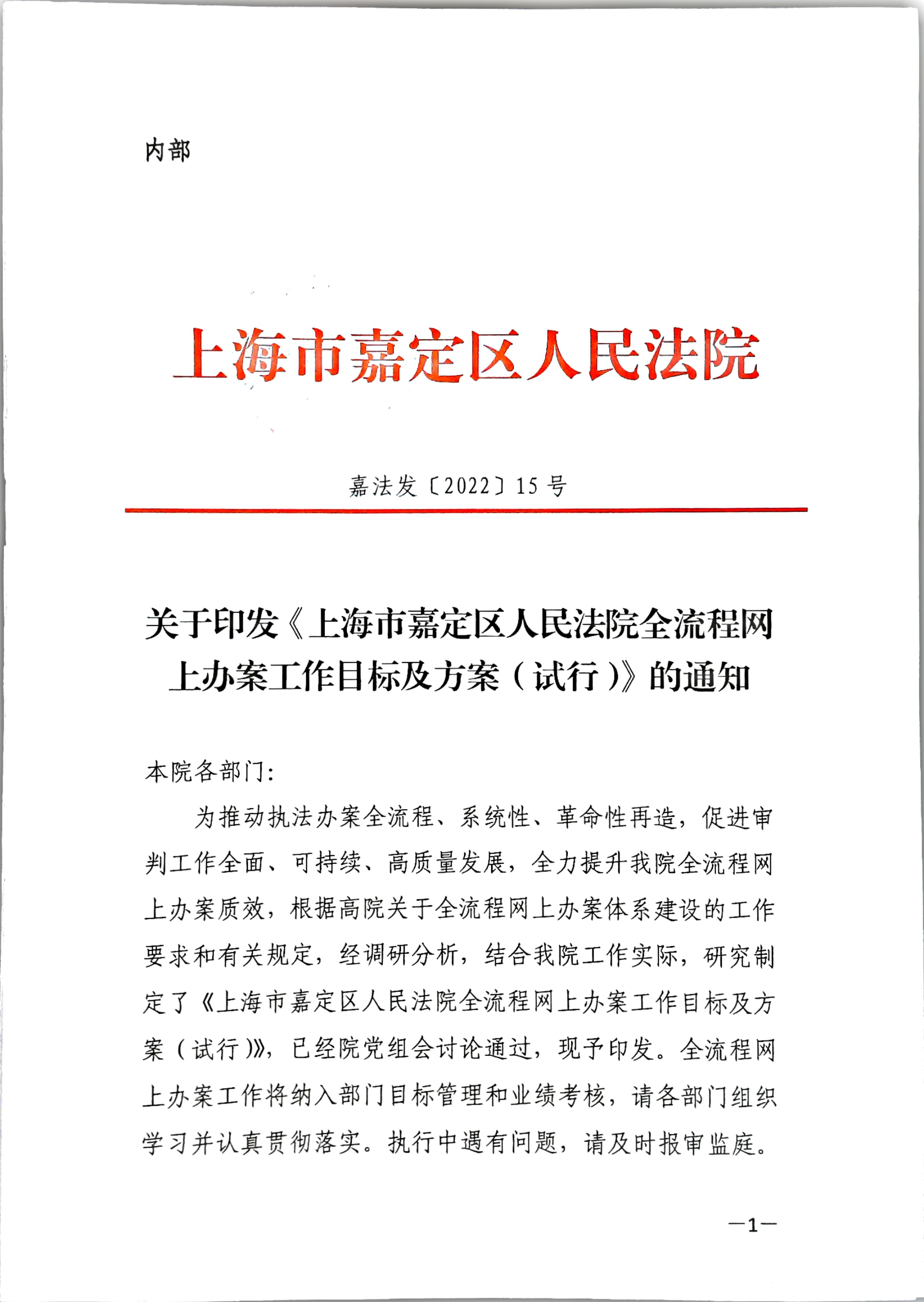 關(guān)于印發(fā)《上海市嘉定區(qū)人民法院全流程網(wǎng)上辦案工作目標(biāo)及方案(試行)》的通知