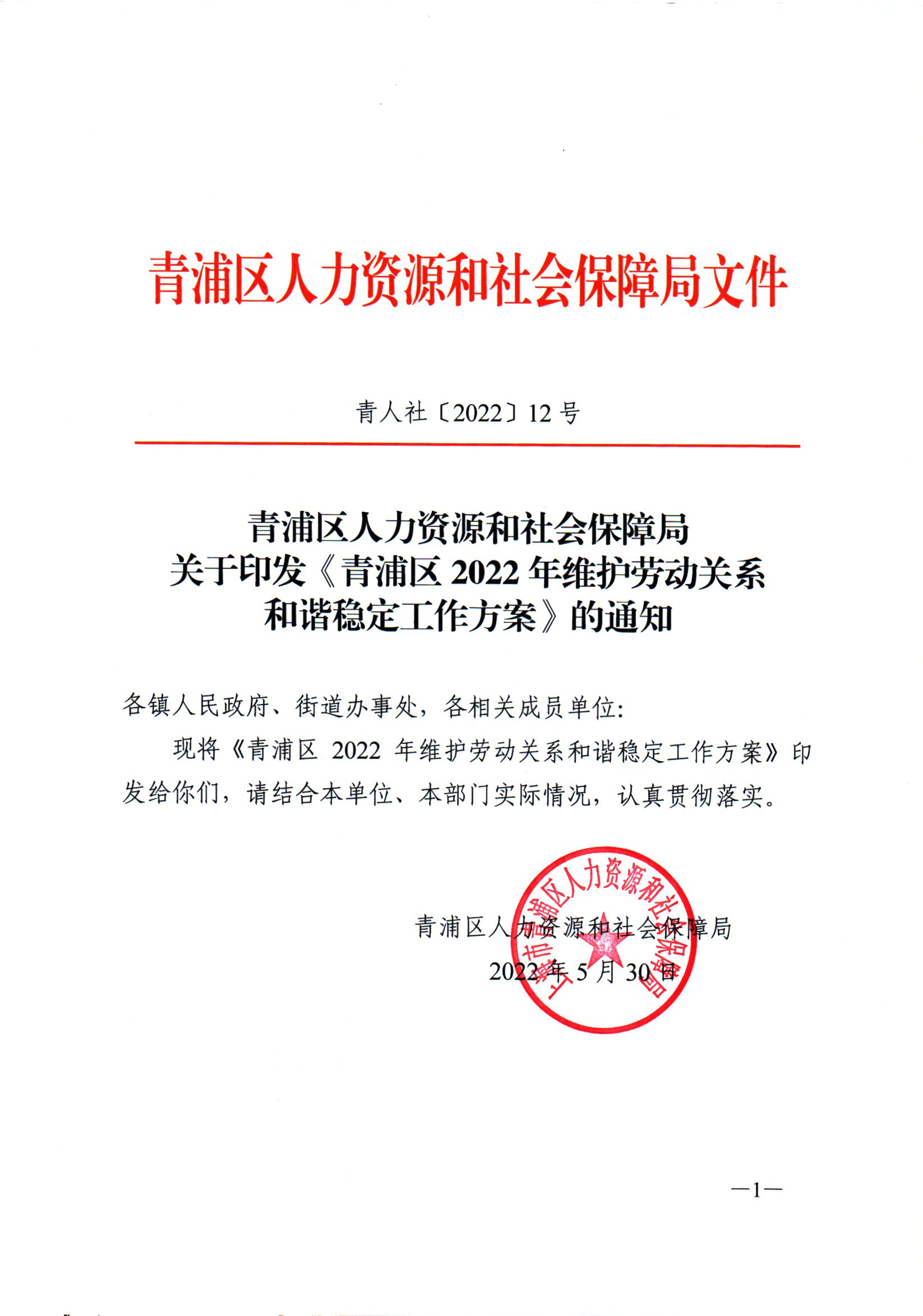 現(xiàn)將《青浦區(qū)2022年維護勞動關(guān)系和諧穩(wěn)定工作方案》印發(fā)給你們,請結(jié)合本單位、本部門實際情況,認真貫徹落實。