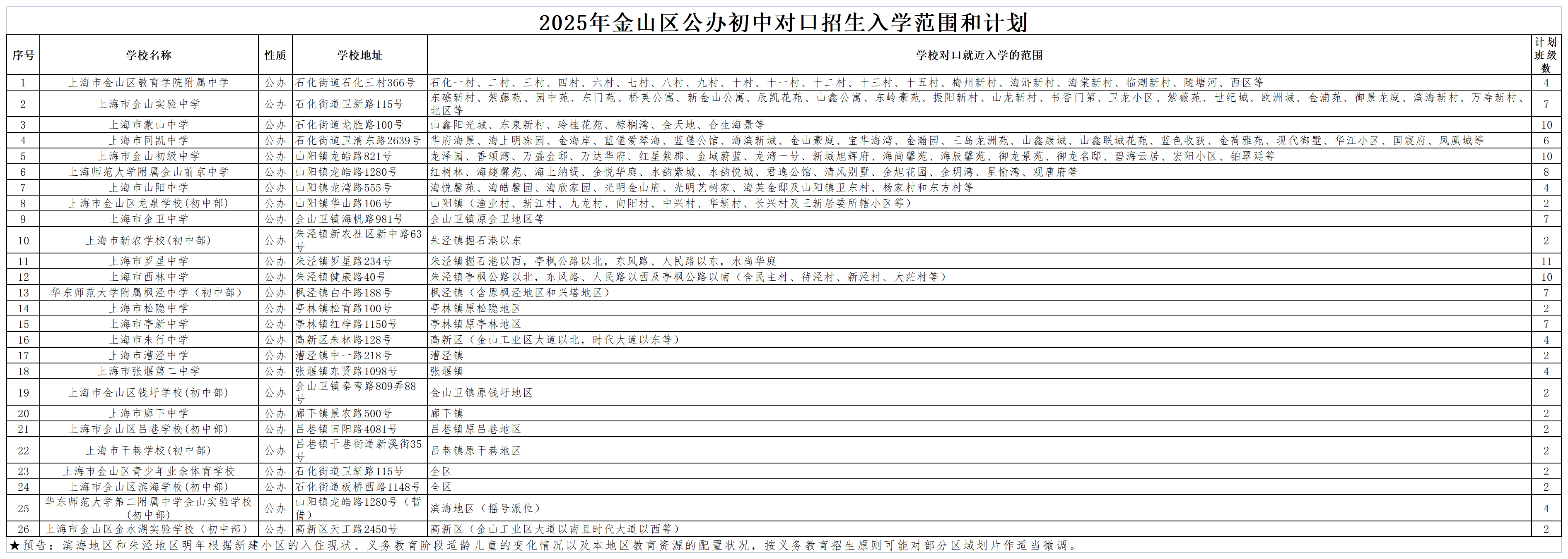 2025年金山區(qū)公辦初中對口招生入學(xué)范圍和計(jì)劃