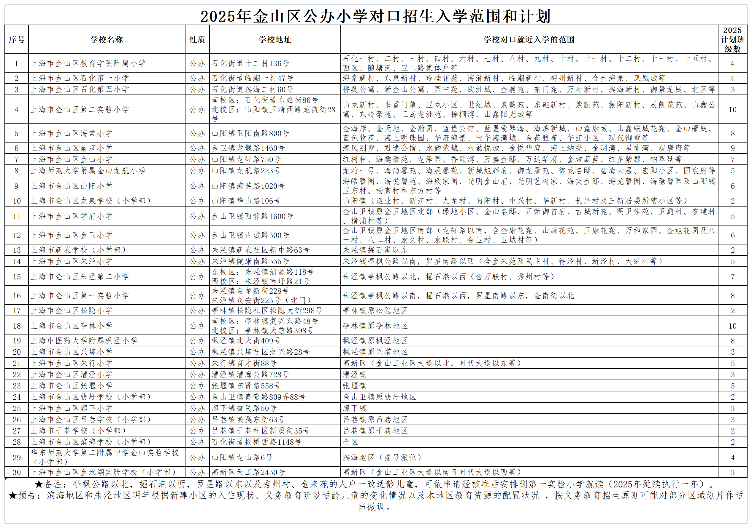 2025年金山區(qū)公辦小學(xué)對(duì)口招生入學(xué)范圍和計(jì)劃
