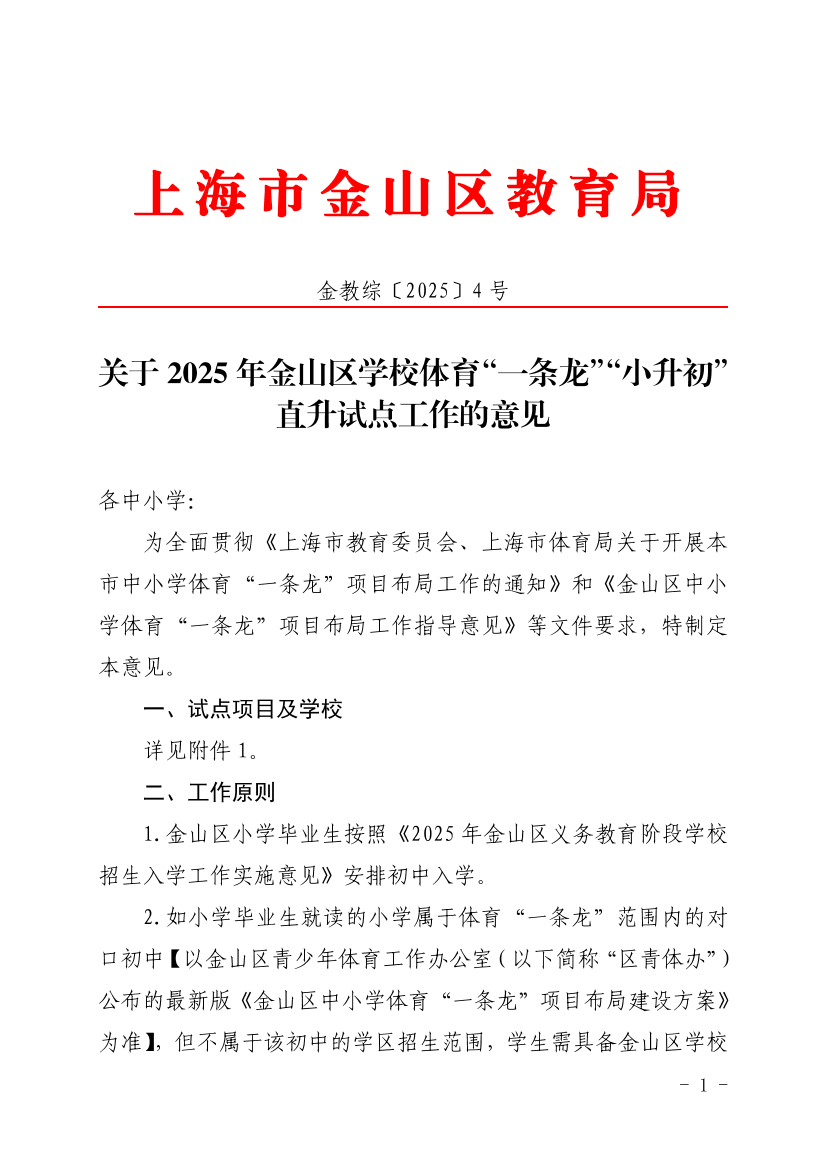 ??根據(jù)區(qū)教育局統(tǒng)一編制公布的《2025年金山區(qū)學(xué)校體育“一條龍”“小升初”優(yōu)秀體育學(xué)生直升計(jì)劃表》(見(jiàn)附件1)實(shí)施跨學(xué)區(qū)名額分配。