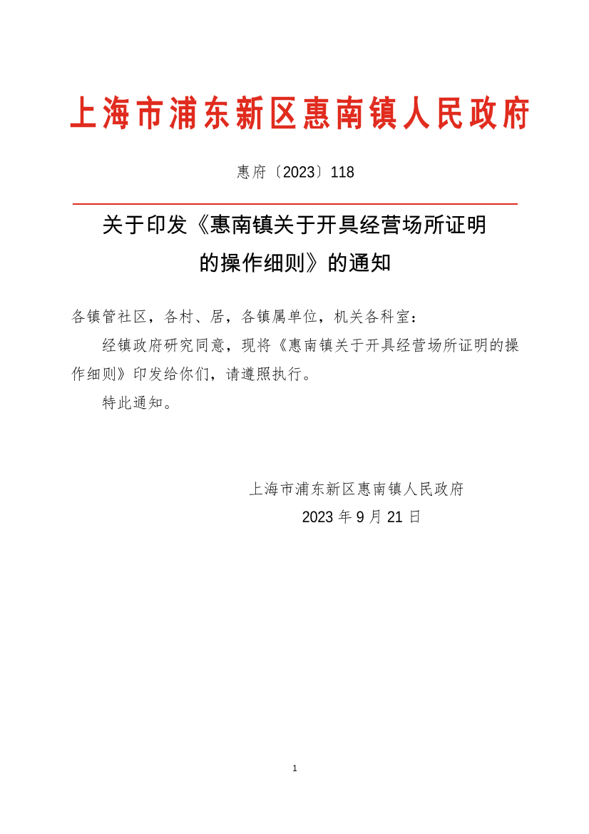 關于印發(fā)《惠南鎮(zhèn)關于開具經(jīng)營場所證明的操作細則》的通知