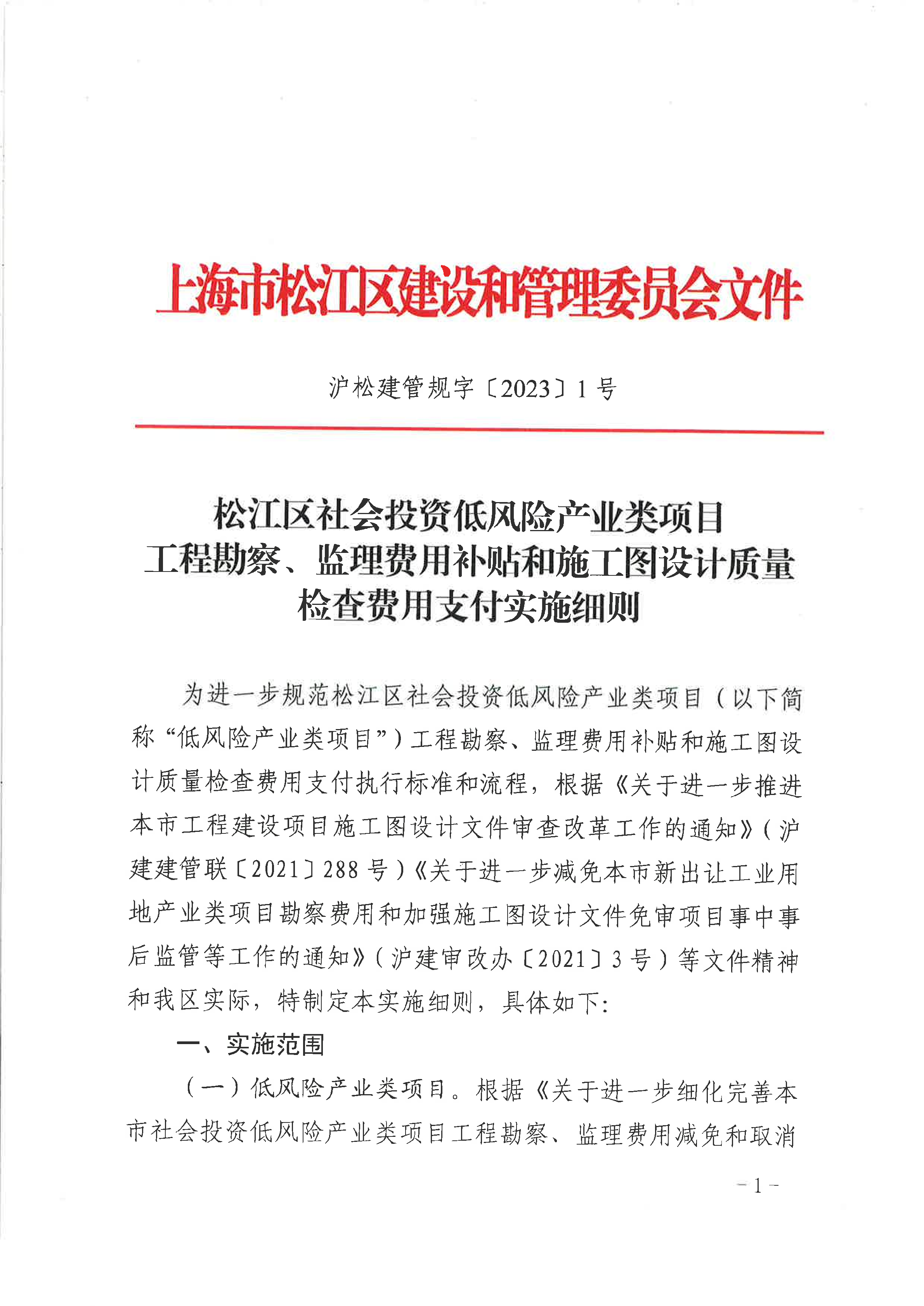??為進(jìn)一步規(guī)范松江區(qū)社會投資低風(fēng)險產(chǎn)業(yè)類項目(以下簡稱“低風(fēng)險產(chǎn)業(yè)類項目”)工程勘察、監(jiān)理費用補(bǔ)貼和施工圖設(shè)計質(zhì)量檢查費用支付執(zhí)行標(biāo)準(zhǔn)和流程,根據(jù)《關(guān)于進(jìn)一步推進(jìn)本市工程建設(shè)項目施工圖設(shè)計文件審查改革工作的通知》(滬建建管聯(lián)〔2021〕288號)《關(guān)于進(jìn)一步減免本市新出讓工業(yè)用地產(chǎn)業(yè)類項目勘察費用和加強(qiáng)施工圖設(shè)計文件免審項目事中事后監(jiān)管等工作的通知》(滬建審改辦〔2021〕3號)等文件精神和我區(qū)實際,特制定本實施細(xì)則,具體如下: