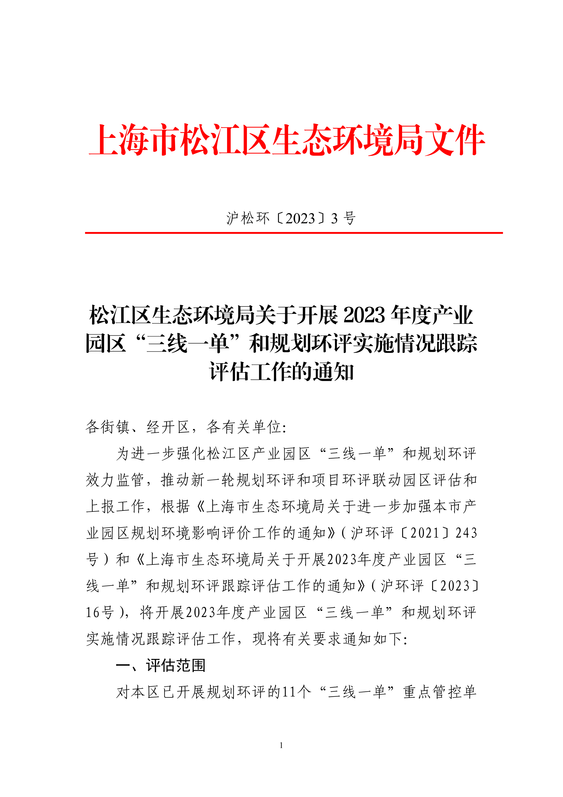 松江區(qū)生態(tài)環(huán)境局關于開展2023年度產(chǎn)業(yè)園區(qū)“三線一單”和規(guī)劃環(huán)評實施情況跟蹤評估工作的通知