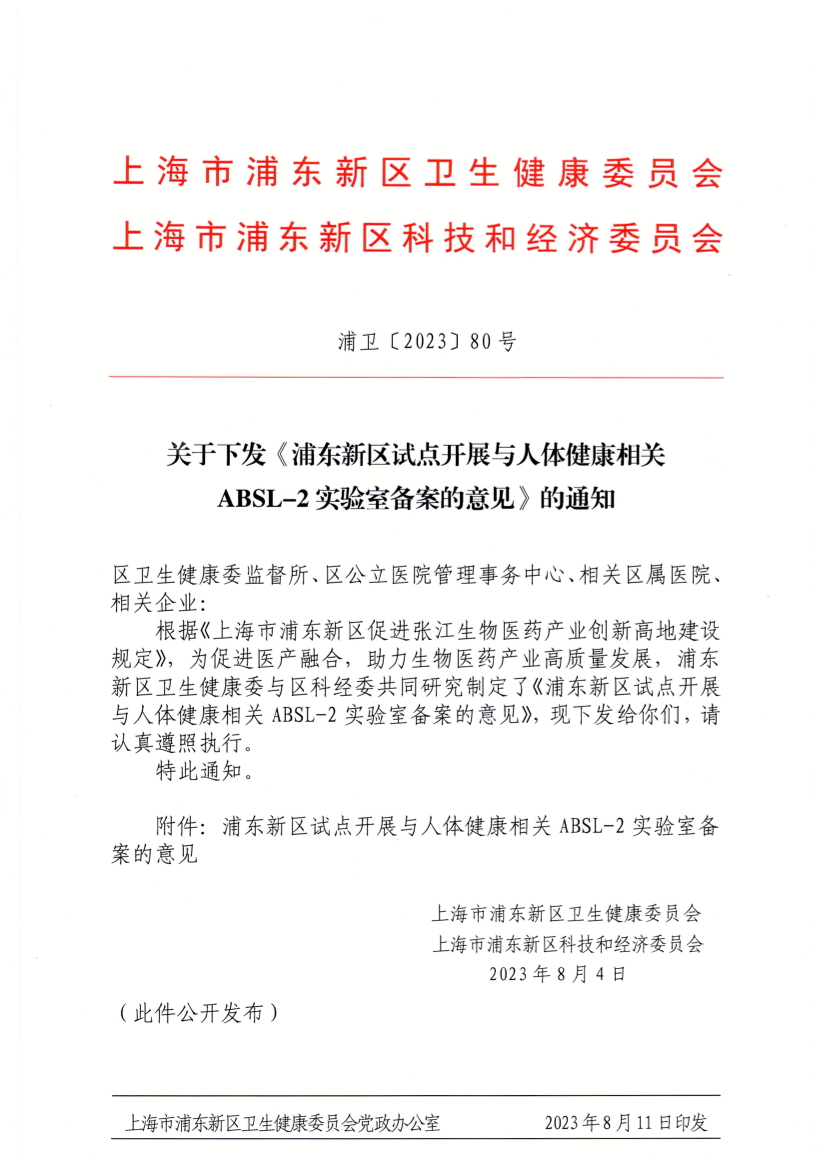 關(guān)于下發(fā)《浦東新區(qū)試點(diǎn)開展與人體健康相關(guān)ABSL-2實驗室備案的意見》的通知