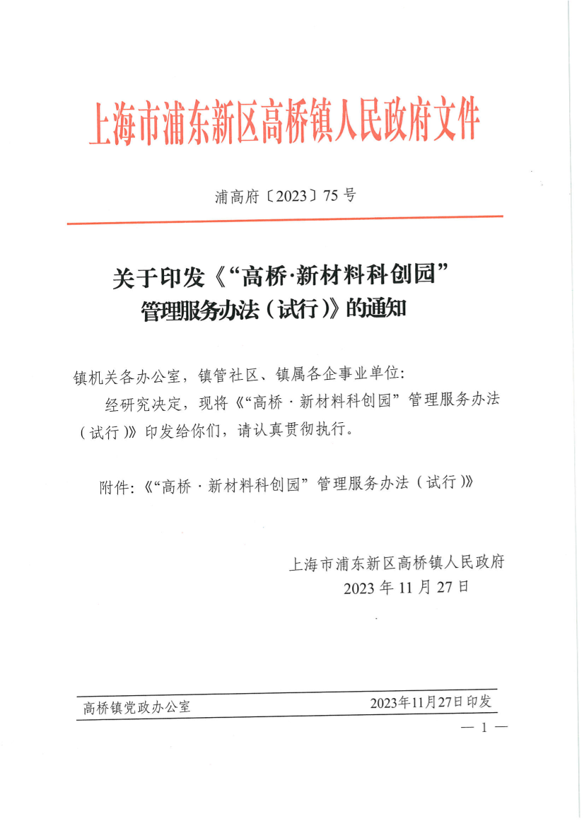 關(guān)于印發(fā)《“高橋?新材料科創(chuàng)園”管理服務(wù)辦法(試行)》的通知