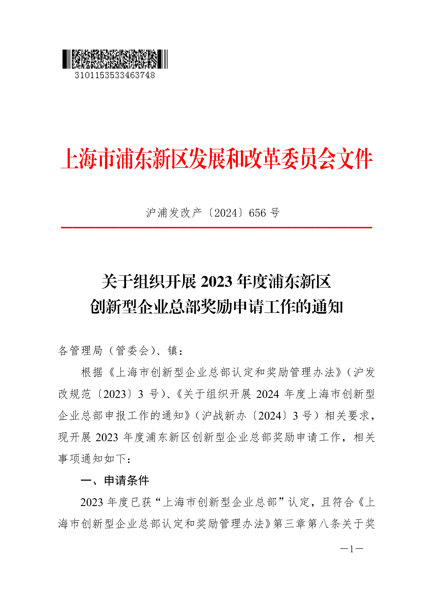 ??根據(jù)《上海市創(chuàng)新型企業(yè)總部認(rèn)定和獎勵管理辦法》(滬發(fā)改規(guī)范〔2023〕3號)、《關(guān)于組織開展2024年度上海市創(chuàng)新型企業(yè)總部申報工作的通知》(滬戰(zhàn)新辦〔2024〕3號)相關(guān)要求,現(xiàn)開展2023年度浦東新區(qū)創(chuàng)新型企業(yè)總部獎勵申請工作,相關(guān)事項通知如下: