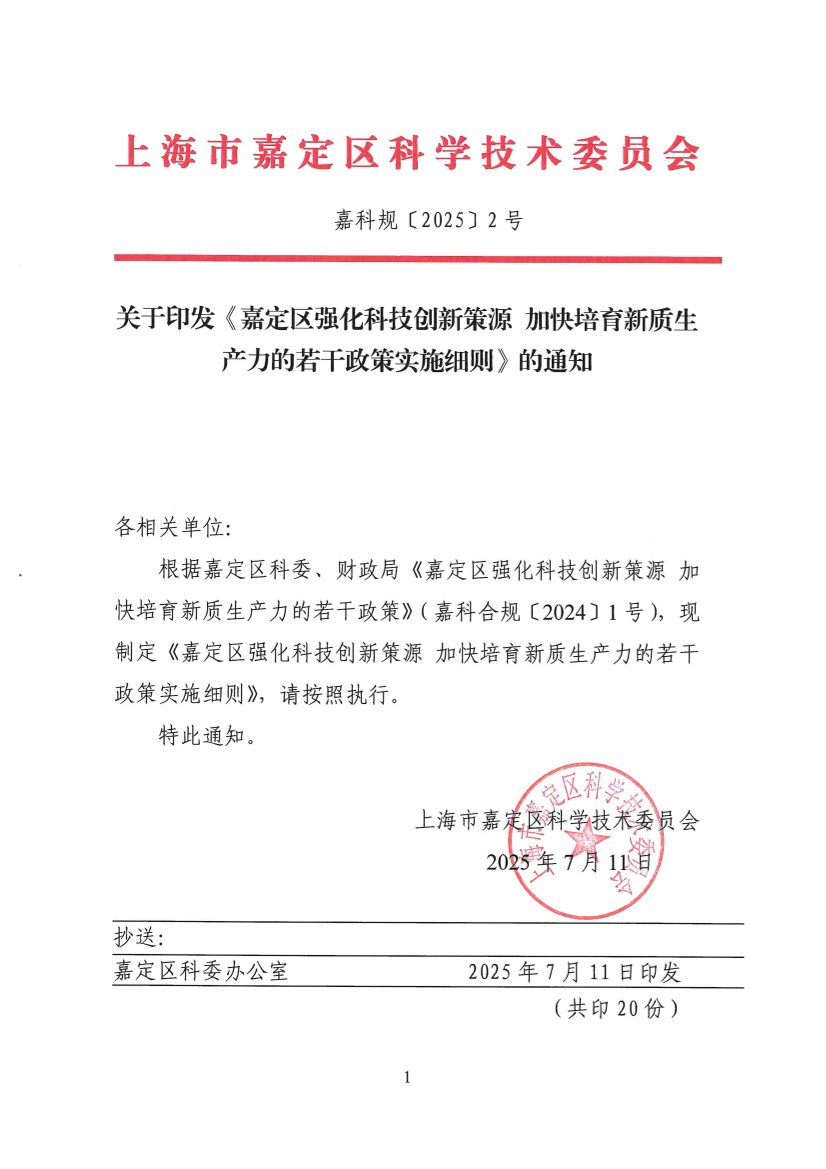 ??根據(jù)嘉定區(qū)科委、財政局《嘉定區(qū)強化科技創(chuàng)新策源 加快培育新質(zhì)生產(chǎn)力的若干政策》(嘉科合規(guī)〔2024〕1號),現(xiàn)制定《嘉定區(qū)強化科技創(chuàng)新策源 加快培育新質(zhì)生產(chǎn)力的若干政策實施細則》,請按照執(zhí)行。