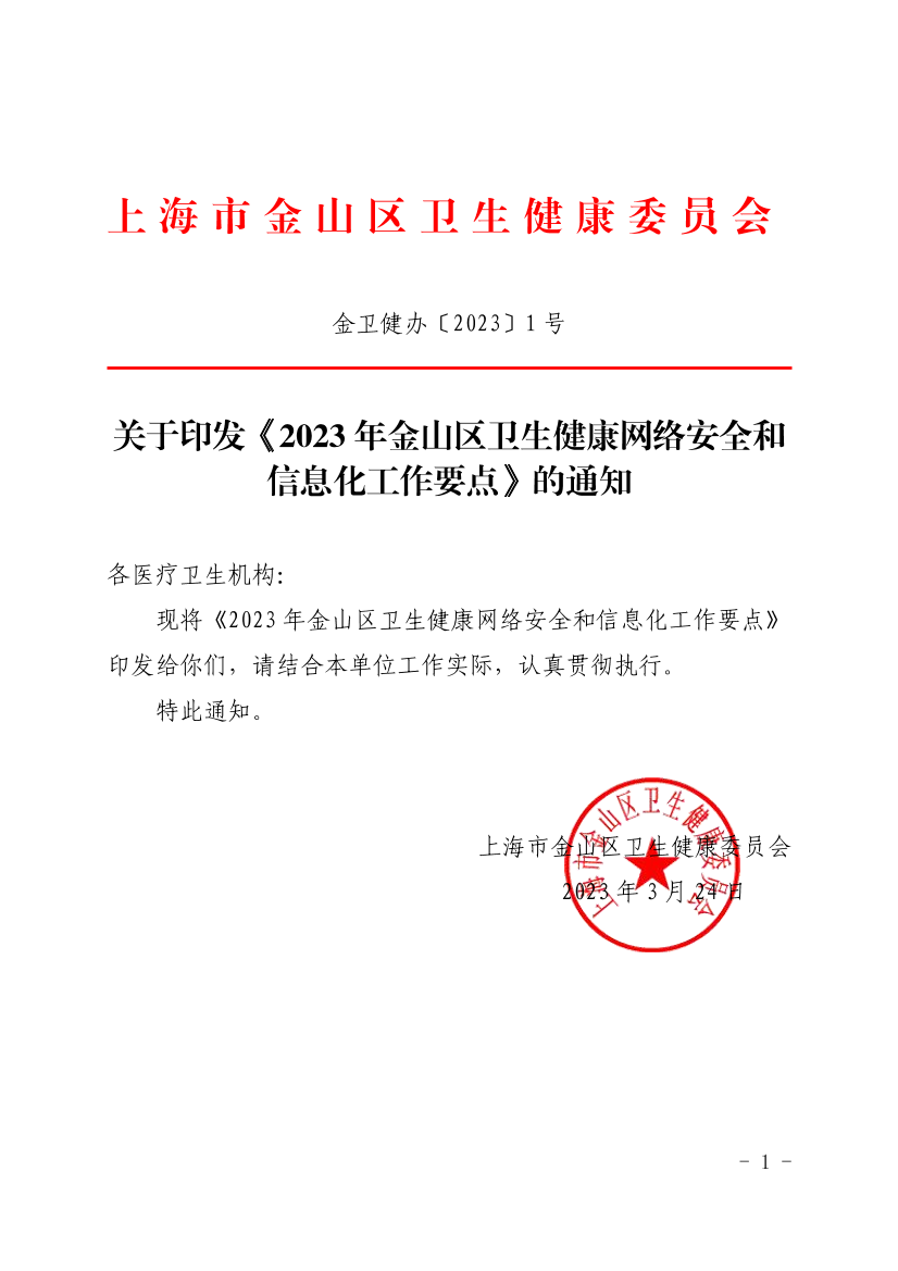 現(xiàn)將《2023年金山區(qū)衛(wèi)生健康網(wǎng)絡(luò)安全和信息化工作要點(diǎn)》印發(fā)給你們,請結(jié)合本單位工作實(shí)際,認(rèn)真貫徹執(zhí)行。