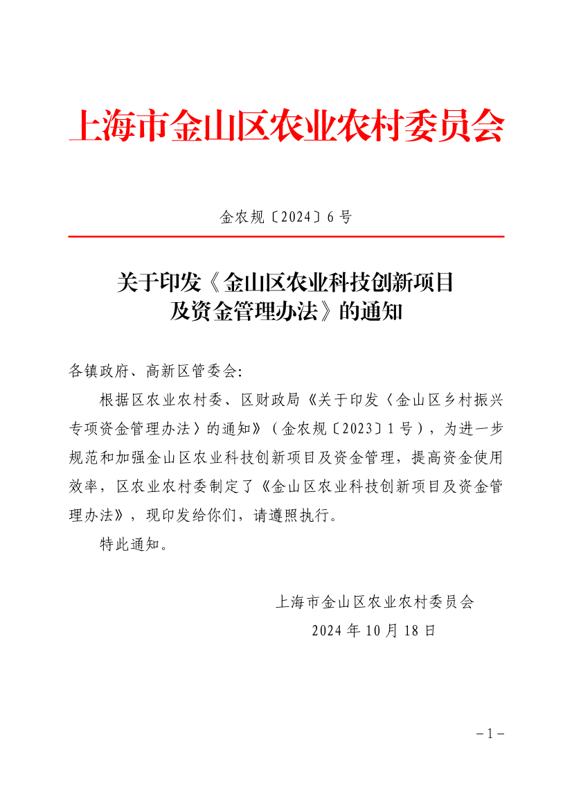 ??第一條 為進一步規(guī)范和加強金山區(qū)農業(yè)科技創(chuàng)新項目及資金管理,提高資金使用效率,充分發(fā)揮科技對都市現代農業(yè)支撐引領作用,推進全國農業(yè)科技現代化先行區(qū)建設,促進本區(qū)農業(yè)創(chuàng)新發(fā)展,根據區(qū)農業(yè)農村委、區(qū)財政局《關于印發(fā)〈金山區(qū)鄉(xiāng)村振興專項資金管理辦法〉的通知》(金農規(guī)〔2023〕1號),結合金山實際,制定本辦法。