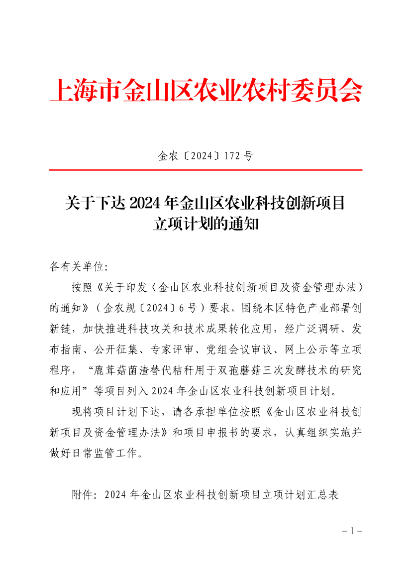 ??按照《關(guān)于印發(fā)〈金山區(qū)農(nóng)業(yè)科技創(chuàng)新項(xiàng)目及資金管理辦法〉的通知》(金農(nóng)規(guī)〔2024〕6號(hào))要求,圍繞本區(qū)特色產(chǎn)業(yè)部署創(chuàng)新鏈,加快推進(jìn)科技攻關(guān)和技術(shù)成果轉(zhuǎn)化應(yīng)用,經(jīng)廣泛調(diào)研、發(fā)布指南、公開征集、專家評(píng)審、黨組會(huì)議審議、網(wǎng)上公示等立項(xiàng)程序,“鹿茸菇菌渣替代秸稈用于雙孢蘑菇三次發(fā)酵技術(shù)的研究和應(yīng)用”等項(xiàng)目列入2024年金山區(qū)農(nóng)業(yè)科技創(chuàng)新項(xiàng)目計(jì)劃。