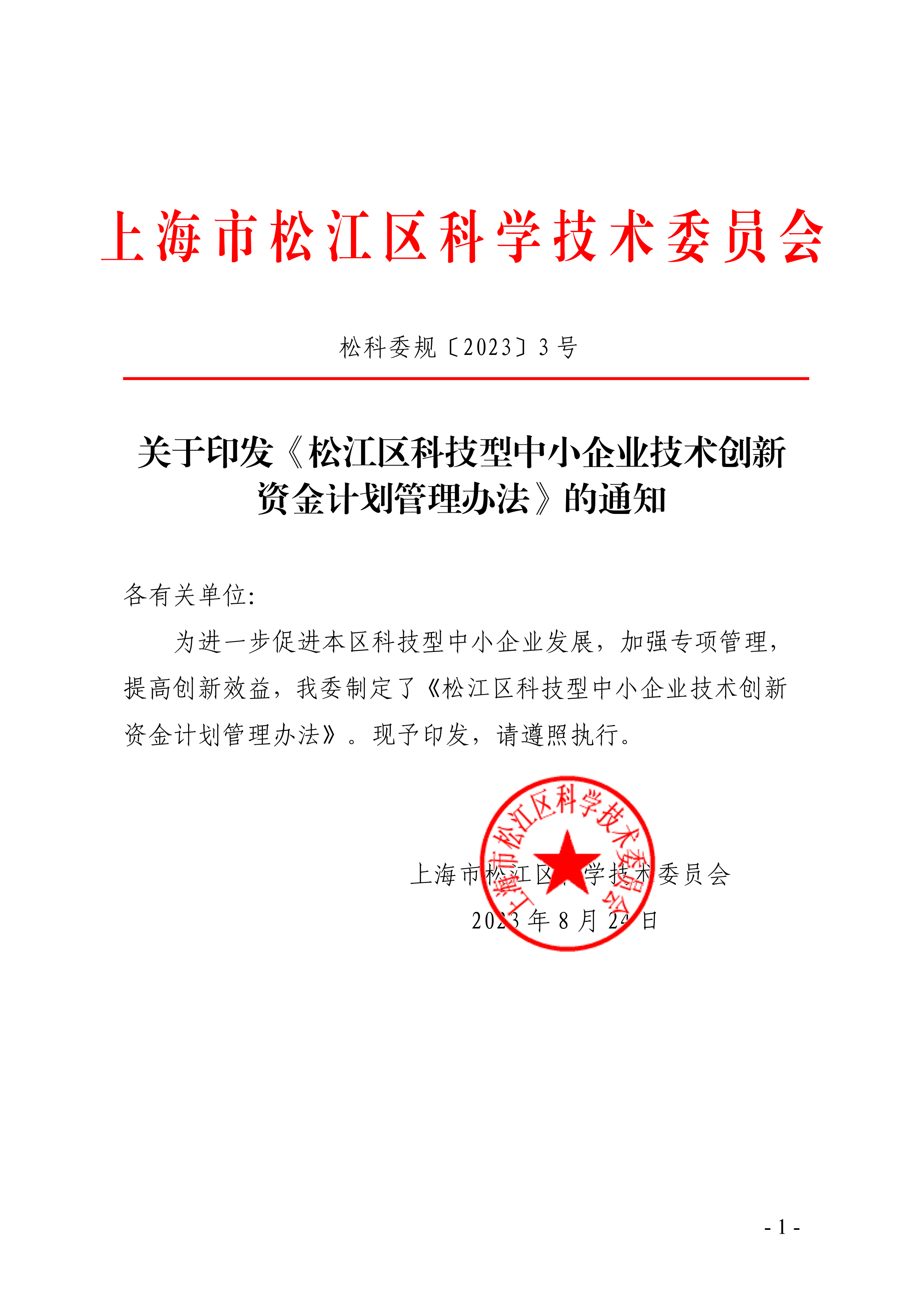 關(guān)于印發(fā)《松江區(qū)科技型中小企業(yè)技術(shù)創(chuàng)新資金計(jì)劃管理辦法》的通知