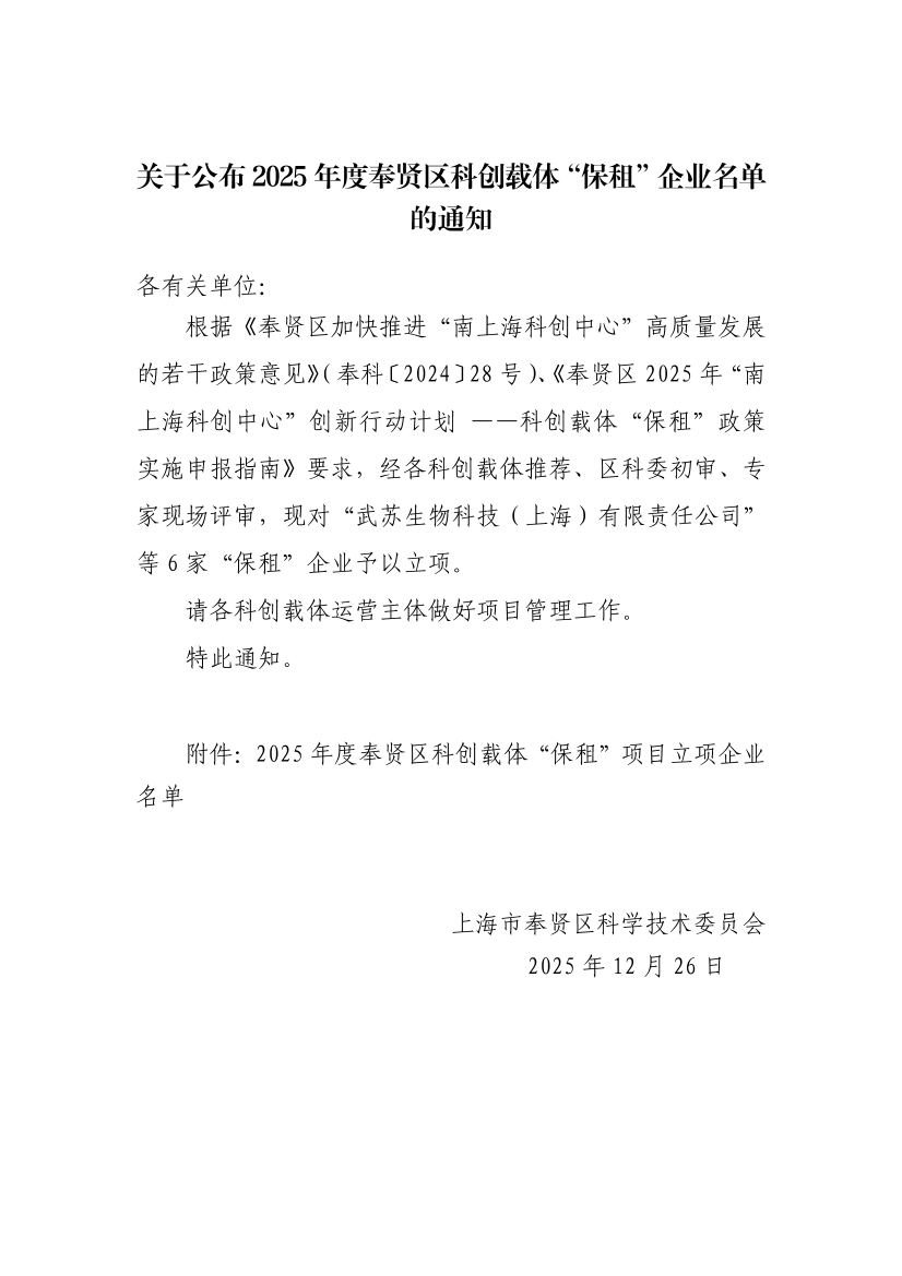 ??根據(jù)《奉賢區(qū)加快推進(jìn)“南上??苿?chuàng)中心”高質(zhì)量發(fā)展的若干政策意見》(奉科〔2024〕28號(hào))、《奉賢區(qū)2025年“南上??苿?chuàng)中心”創(chuàng)新行動(dòng)計(jì)劃 ——科創(chuàng)載體“保租”政策實(shí)施申報(bào)指南》要求,經(jīng)各科創(chuàng)載體推薦、區(qū)科委初審、專家現(xiàn)場(chǎng)評(píng)審,現(xiàn)對(duì)“武蘇生物科技(上海)有限責(zé)任公司”等6家“保租”企業(yè)予以立項(xiàng)。