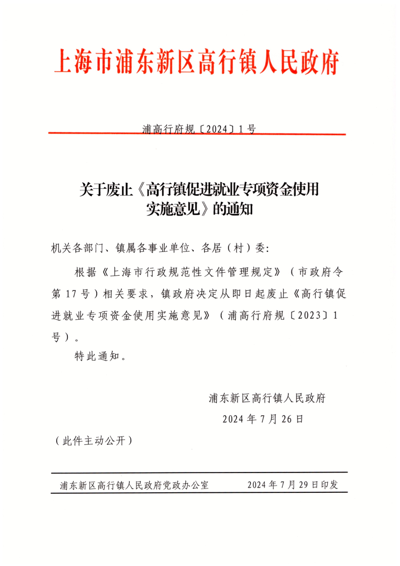??根據(jù)《上海市行政規(guī)范性文件管理規(guī)定》(市政府令第17號)相關(guān)要求,鎮(zhèn)政府決定從即日起廢止《高行鎮(zhèn)促進就業(yè)專項資金使用實施意見》(浦高行府規(guī)〔2023〕1號)。