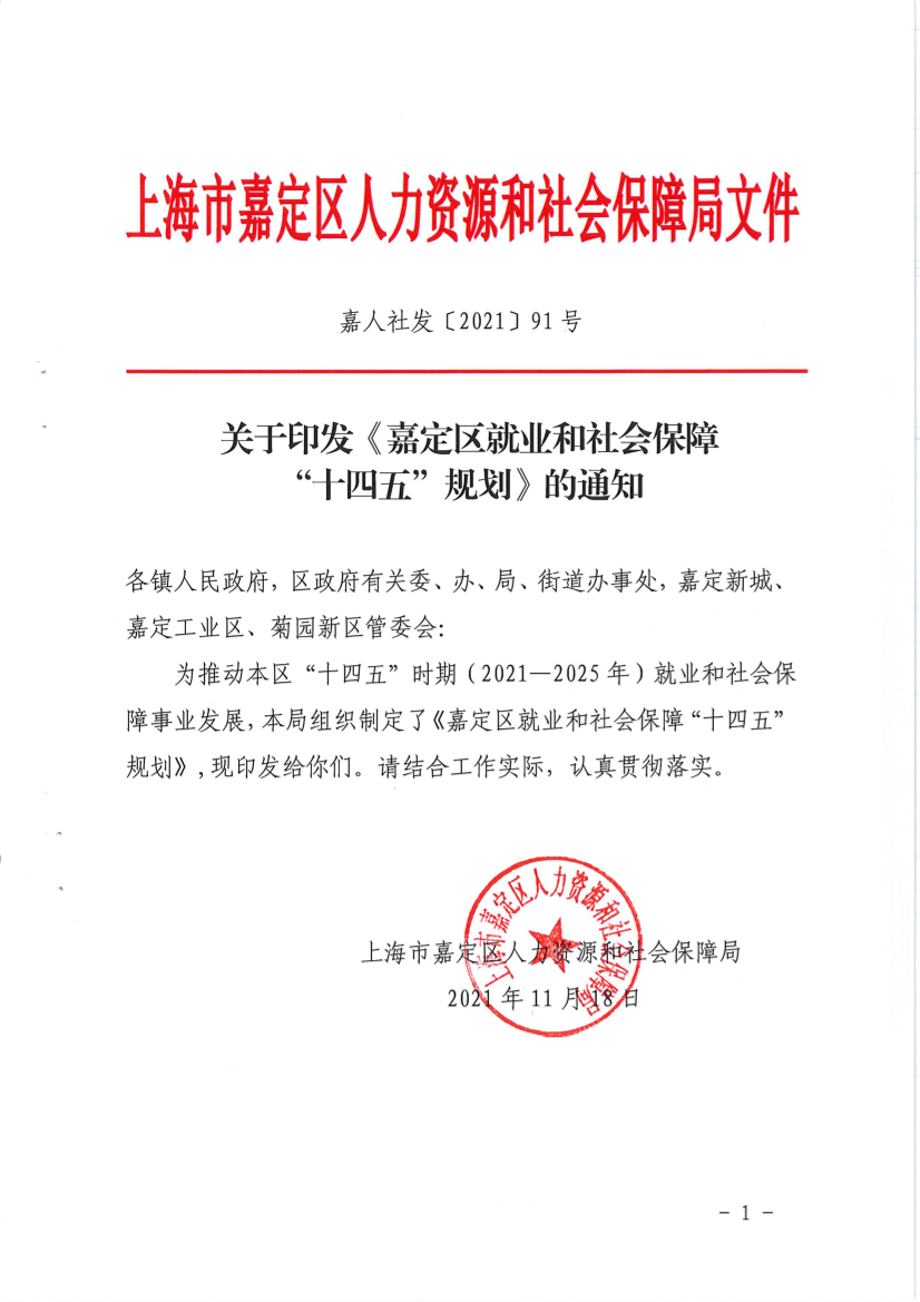 關(guān)于印發(fā)《嘉定區(qū)就業(yè)和社會保障 “十四五”規(guī)劃》的通知