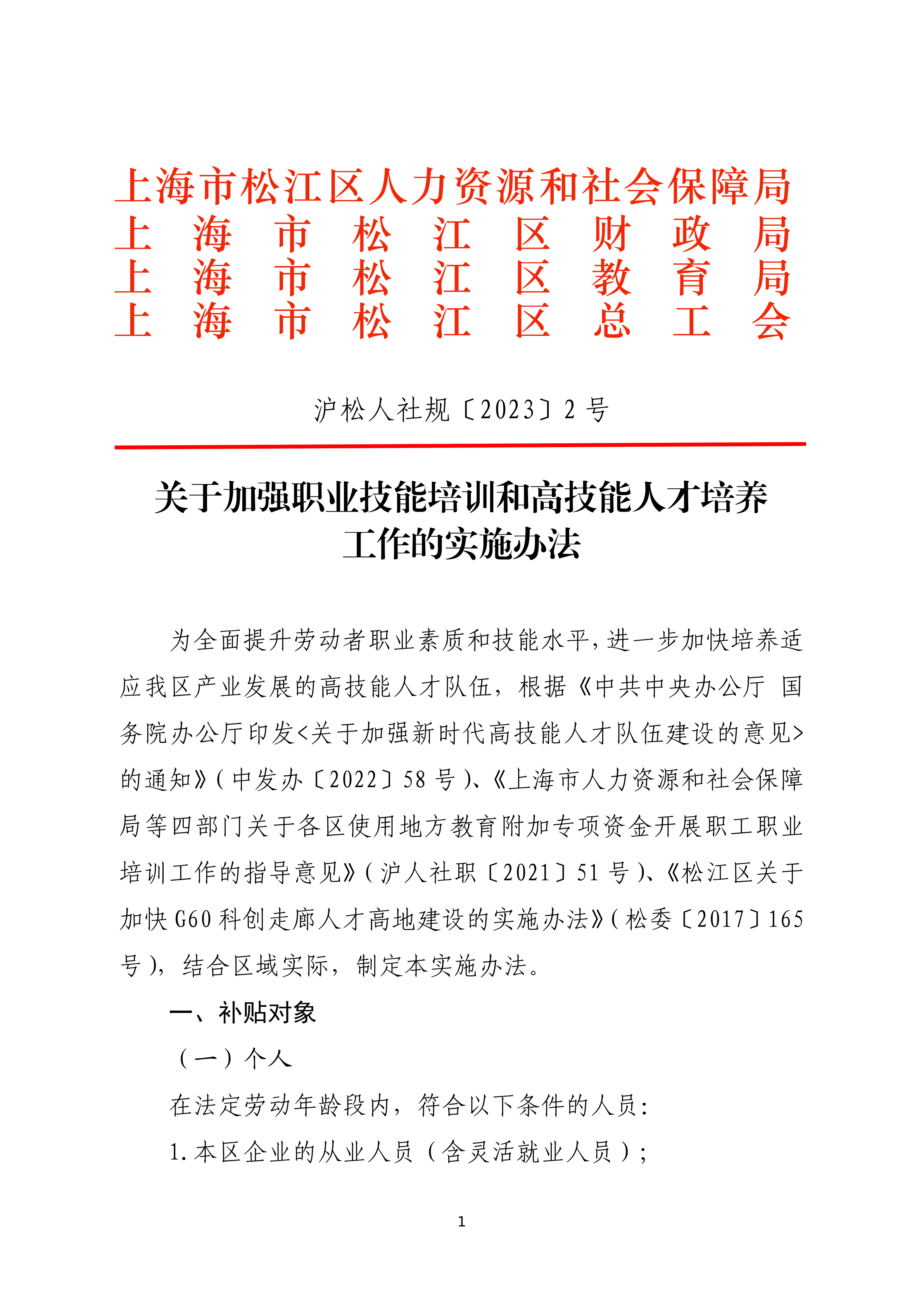 ??為全面提升勞動者職業(yè)素質和技能水平,進一步加快培養(yǎng)適應我區(qū)產(chǎn)業(yè)發(fā)展的高技能人才隊伍,根據(jù)《中共中央辦公廳 國務院辦公廳印發(fā)<關于加強新時代高技能人才隊伍建設的意見>的通知》(中發(fā)辦〔2022〕58號)、《上海市人力資源和社會保障局等四部門關于各區(qū)使用地方教育附加專項資金開展職工職業(yè)培訓工作的指導意見》(滬人社職〔2021〕51號)、《松江區(qū)關于加快G60科創(chuàng)走廊人才高地建設的實施辦法》(松委〔2017〕165號),結合區(qū)域實際,制定本實施辦法。