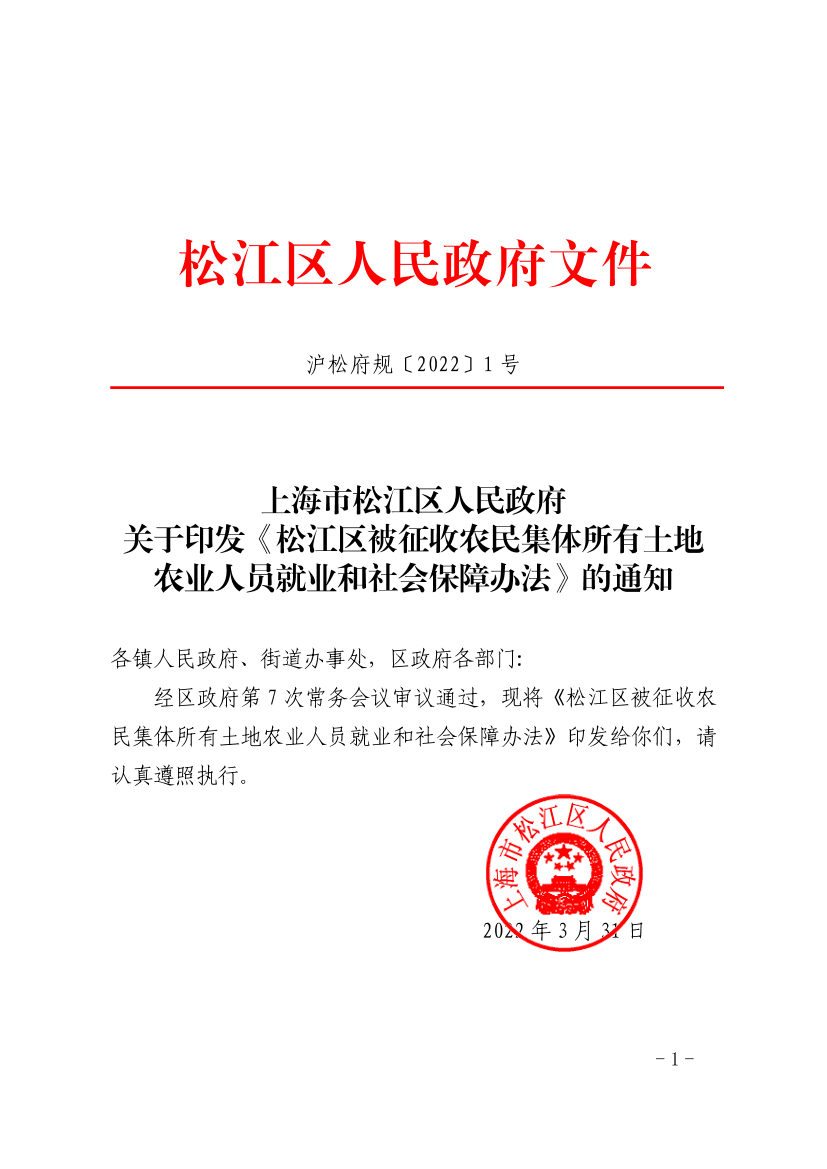 關(guān)于印發(fā)《松江區(qū)被征收農(nóng)民集體所有土地農(nóng)業(yè)人員就業(yè)和社會保障辦法》的通知
