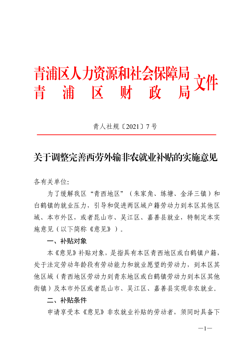 ??本《意見》補貼對象,是指具有本區(qū)青西地區(qū)或白鶴鎮(zhèn)戶籍,處于法定勞動年齡段有勞動能力和就業(yè)愿望的勞動力,到本區(qū)其他區(qū)域(青西地區(qū)勞動力到青東地區(qū)或白鶴鎮(zhèn)勞動力到本區(qū)其他街鎮(zhèn))及本市外區(qū)或者昆山市、吳江區(qū)、嘉善縣實現(xiàn)非農(nóng)就業(yè)。