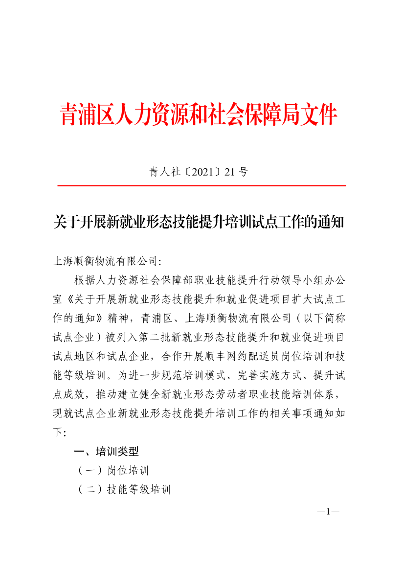 根據(jù)人力資源社會(huì)保障部職業(yè)技能提升行動(dòng)領(lǐng)導(dǎo)小組辦公室《關(guān)于開展新就業(yè)形態(tài)技能提升和就業(yè)促進(jìn)項(xiàng)目擴(kuò)大試點(diǎn)工作的通知》精神,青浦區(qū)、上海順衡物流有限公司(以下簡稱試點(diǎn)企業(yè))被列入第二批新就業(yè)形態(tài)技能提升和就業(yè)促進(jìn)項(xiàng)目試點(diǎn)地區(qū)和試點(diǎn)企業(yè),合作開展順豐網(wǎng)約配送員崗位培訓(xùn)和技能等級培訓(xùn)。為進(jìn)一步規(guī)范培訓(xùn)模式、完善實(shí)施方式、提升試點(diǎn)成效,推動(dòng)建立健全新就業(yè)形態(tài)勞動(dòng)者職業(yè)技能培訓(xùn)體系,現(xiàn)就試點(diǎn)企業(yè)新就業(yè)形態(tài)技能提升培訓(xùn)工作的相關(guān)事項(xiàng)通知如下: