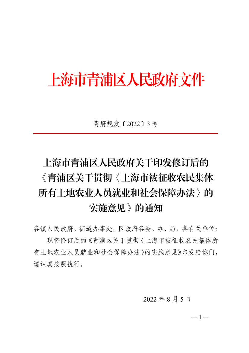 ??現(xiàn)將修訂后的《青浦區(qū)關(guān)于貫徹〈上海市被征收農(nóng)民集體所有土地農(nóng)業(yè)人員就業(yè)和社會保障辦法〉的實(shí)施意見》印發(fā)給你們,請認(rèn)真按照執(zhí)行。