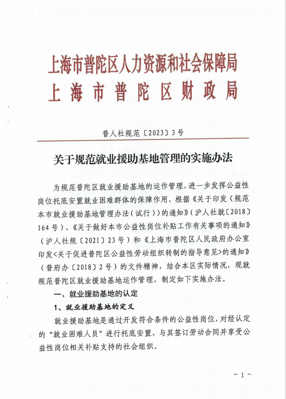 ??為規(guī)范普陀區(qū)就業(yè)援助基地的運作管理,進一步發(fā)揮公益性崗位托底安置就業(yè)困難群體的保障作用,根據(jù)《關于印發(fā)〈規(guī)范本市就業(yè)援助基地管理辦法(試行)〉的通知》(滬人社就〔2018〕164號)、《關于做好本市公益性崗位補貼工作有關事項的通知》(滬人社規(guī)〔2021〕23號)和《上海市普陀區(qū)人民政府辦公室印發(fā)<關于促進普陀區(qū)公益性勞動組織轉制的指導意見>的通知》(普府辦〔2018〕2號)的文件精神,結合本區(qū)實際情況,現(xiàn)就規(guī)范普陀區(qū)就業(yè)援助基地運作管理,制定如下實施辦法。