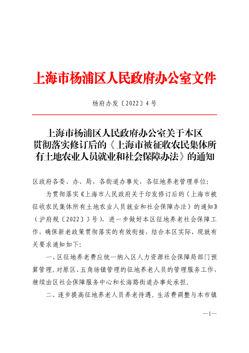 ??七、區(qū)人力資源社會保障局、區(qū)財政局、區(qū)醫(yī)療保障局等部門根據(jù)本通知,制定《楊浦區(qū)征地養(yǎng)老人員管理辦法》。