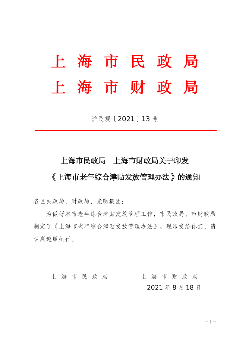 ??為做好本市老年綜合津貼發(fā)放管理工作,市民政局、市財(cái)政局制定了《上海市老年綜合津貼發(fā)放管理辦法》?,F(xiàn)印發(fā)給你們,請(qǐng)認(rèn)真遵照?qǐng)?zhí)行。