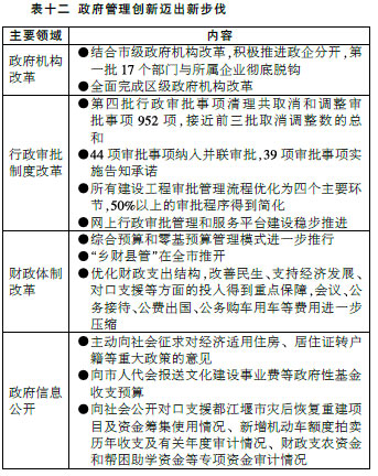 加快政府管理創(chuàng)新。切實增強依法行政意識,提高執(zhí)法公信力,嚴(yán)格按照法定權(quán)限和程序行使權(quán)力、履行職責(zé)。研究完善“兩級政府、三級管理”體制,健全市區(qū)分稅制和轉(zhuǎn)移支付制度,促進(jìn)區(qū)域協(xié)調(diào)聯(lián)動發(fā)展。繼續(xù)深化行政審批制度改革,全方位推進(jìn)行政審批標(biāo)準(zhǔn)化建設(shè)和網(wǎng)上審批系統(tǒng)建設(shè),擴大告知承諾和并聯(lián)審批實施范圍,再取消一批審批事項,再簡化一批事項的審批環(huán)節(jié),再下放一批事項的審批權(quán)到區(qū)縣。繼續(xù)清理行政事業(yè)性收費,尤其是工本類、資質(zhì)資格類、登記類等收費事項,嚴(yán)格控制新增收費。加大政府投資項目、公共政策、公共服務(wù)信息的公開力度,推進(jìn)財政性資金和社會公共資金公開透明運行,依法推進(jìn)審計公開,進(jìn)一步提高行政透明度。全面完成政企分開、政社分開改革,加快政府職能轉(zhuǎn)變?! ?/p>